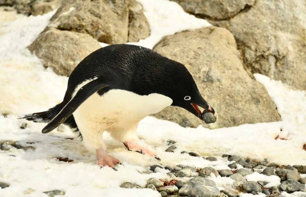 和帽带企鹅一样,阿德利企鹅也喜爱捡石头,用小石头垒起圆形小窝。