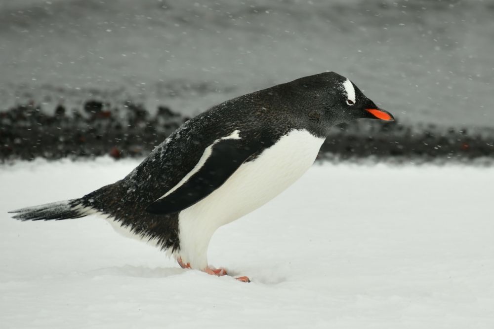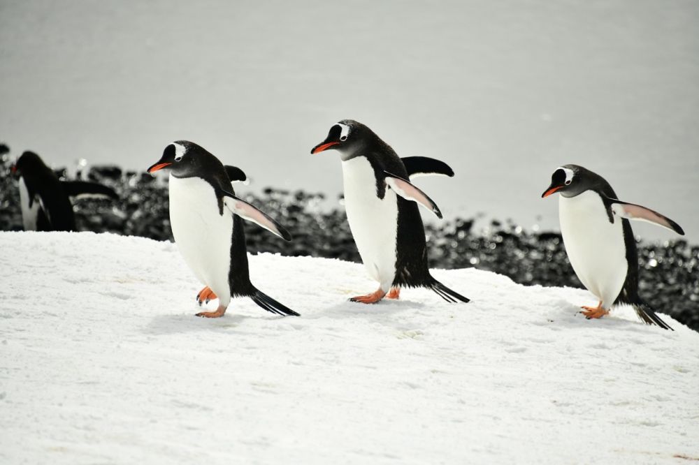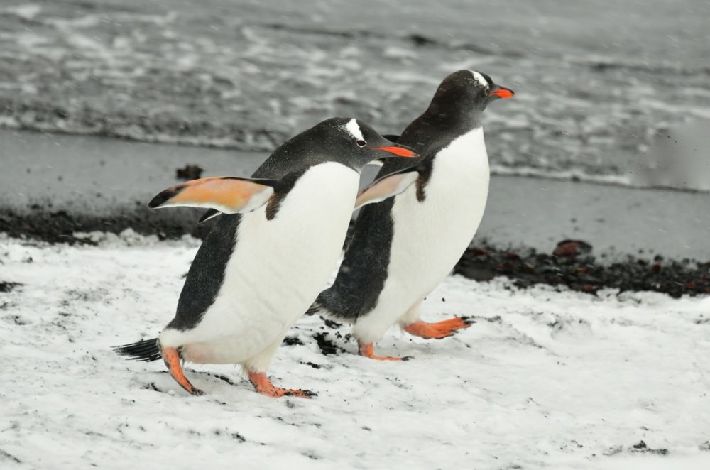 排在帝企鹅,王企鹅后边,金图企鹅的身高是第三名,约七十五到九十厘米。不过几次目测,感觉没那么高。模样倒是好辨识,头部从眼睛到头顶两块白色三角,像是带着一个头巾。而Gentoo源自葡萄牙语,正是头巾的意思。它的眼睛上方也有一个明显的白斑,嘴是红色的,脸部轮廓清晰,看起来整洁干净,还有一双企鹅中独一无二,鲜黄夺目的大脚。另外,在求偶时,和王企鹅一样,公企鹅会向对方鞠躬示好,所以还有个外号叫绅士企鹅。