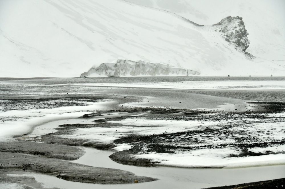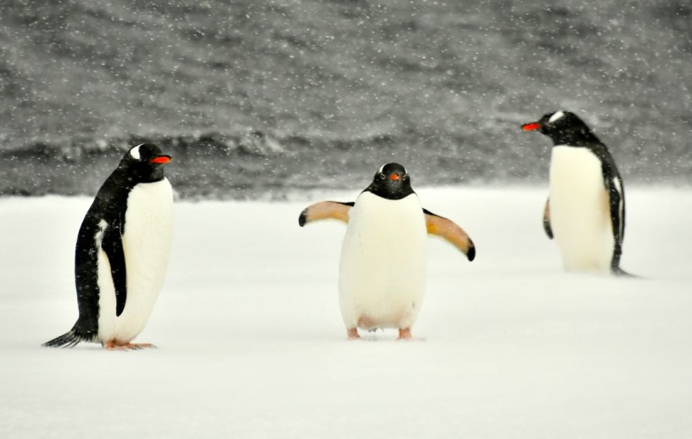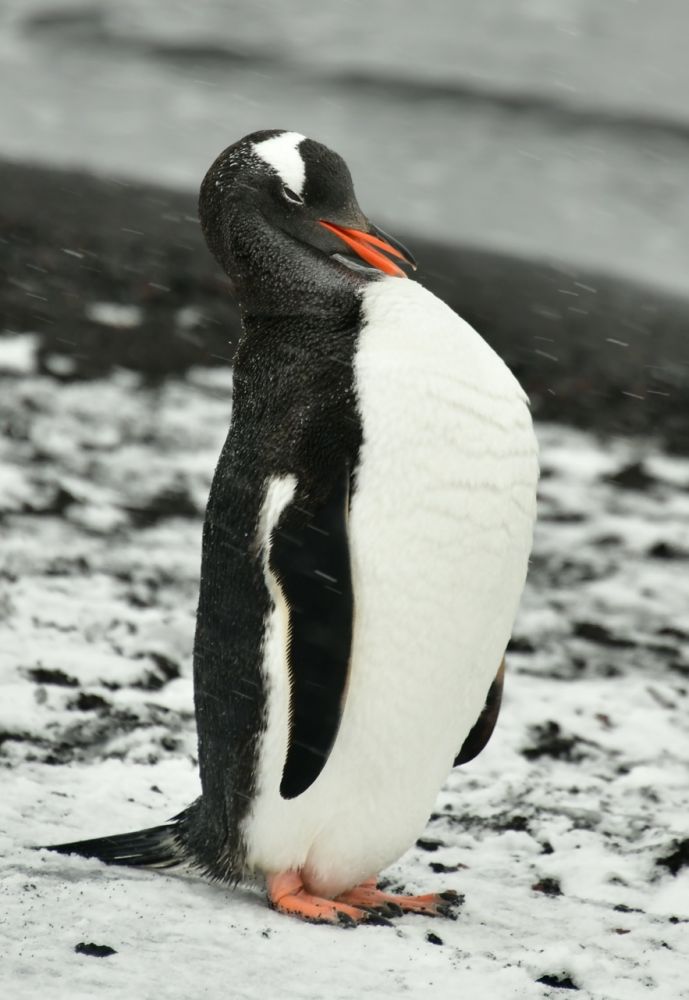 我们行程中的第一次登陆,上的是奇幻岛(Deception Island),这个岛常被人译为欺骗岛。天气阴沉沉的,下着小雪。金图企鹅在小雪中唱歌,跳舞,或者闭目养神,看起来很喜欢这样的天气。