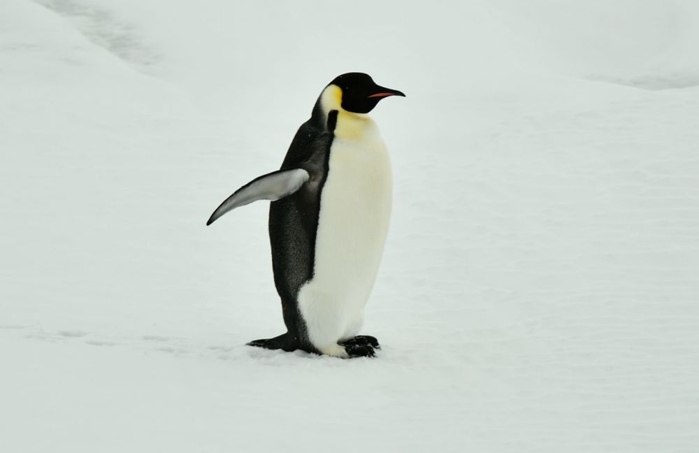我们乘的游轮带着三架直升机,是冲着雪丘岛上的帝企鹅去的,可惜因为今年的天气没能成功登陆。不过,船在距离雪丘岛一百公里的地方等待的时候,两只帝企鹅前来访问了我们,第一只在离船很近的冰块上,第二只也在附近游来游去,我们也得以通过拍照了解它们的部分生活习性。