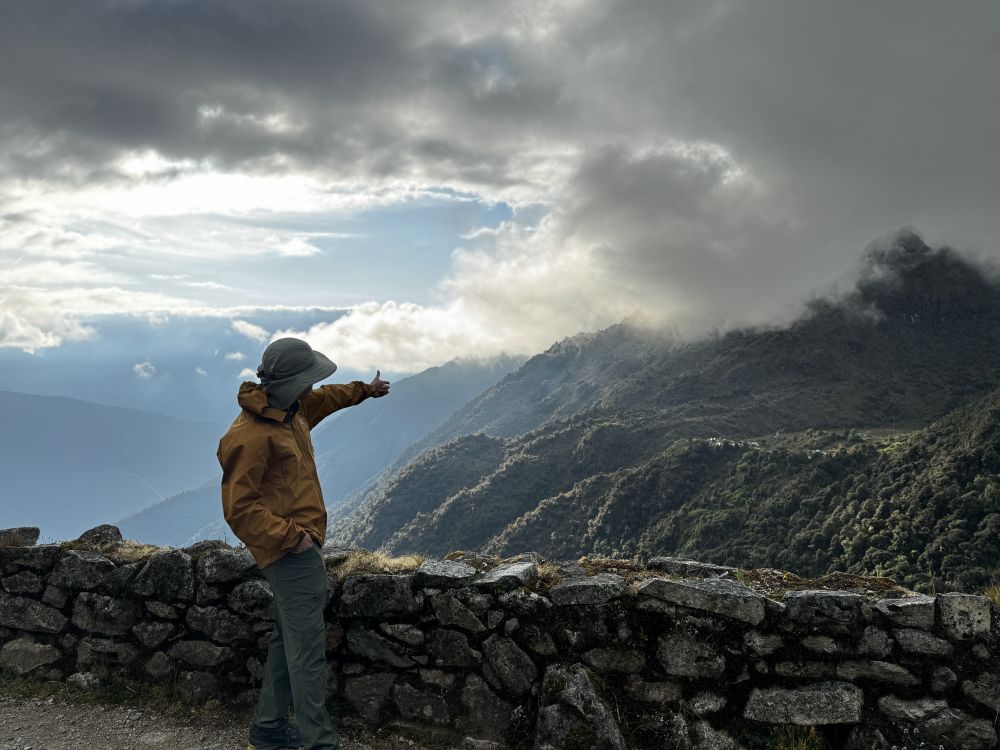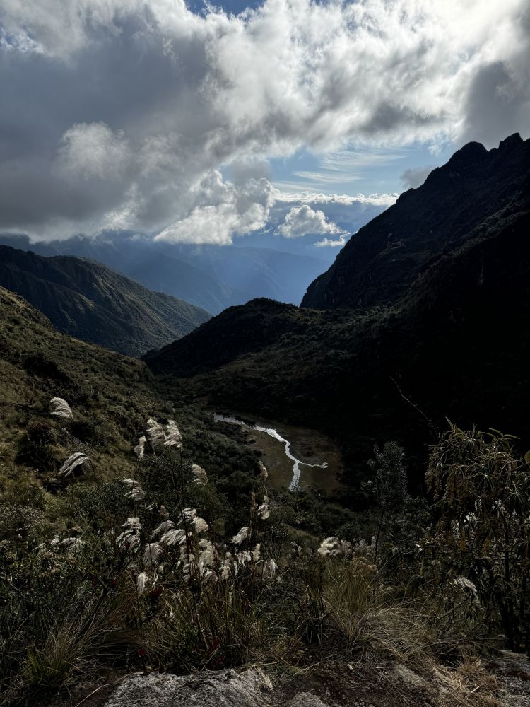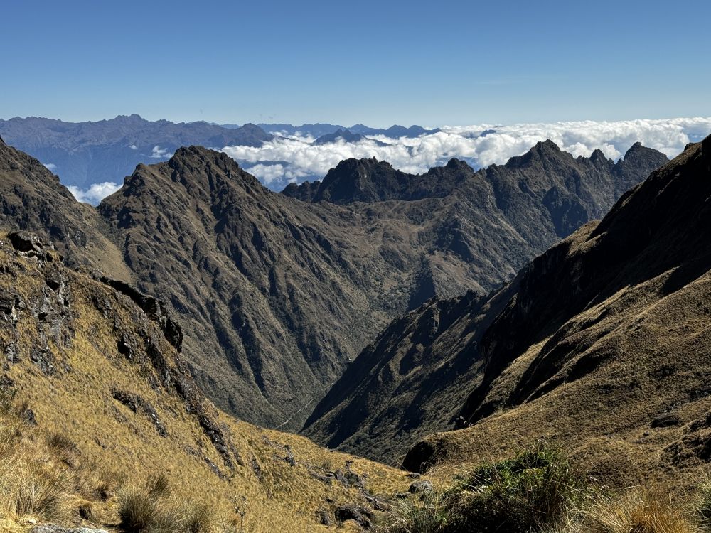 眼前一望无际的安第斯山脉,马丘比丘就隐藏在远处的云里。我们午餐营地在此山的底部,远方隐隐约约的步道是午餐后得翻越的另外一座山。