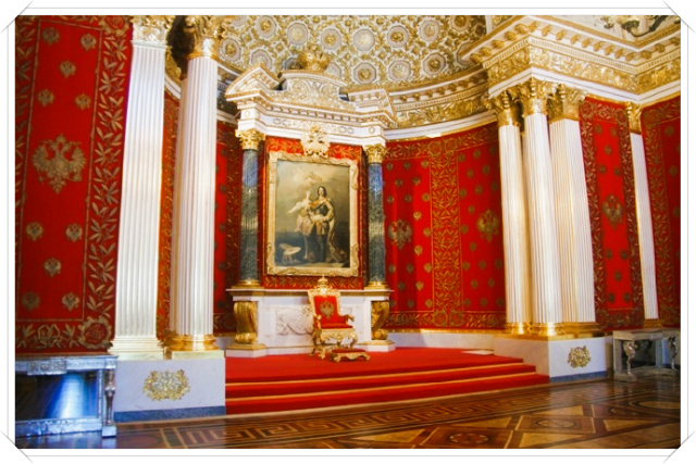 冬宫内的彼得厅/小金銮厅是为纪念俄罗斯帝国的缔造者彼得大帝而建的小型会见场所。墙龛里天鹅绒装饰的墙上挂着彼得大帝和智慧女神弥涅尔娃的画像和这位俄国第一位沙皇的标志物——“彼得大帝”的花体字、皇冠、双头鹰。下面是英国制的彼得大帝金銮椅,御座上镶嵌着镀金银饰,椅背用银线绣着俄国的国徽。