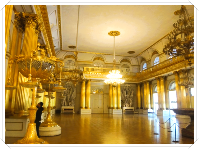 冬宫金碧辉煌的徽章大厅/亚历山大厅有1000平方米,是冬宫中最大的一个厅。全部柱子及屋顶装饰都是用黄金包裹的。大厅中央悬挂着青铜大吊灯,上面镶嵌着当时俄国各省的省徽。整间大厅的设计和建筑体现了俄罗斯帝国的强盛,沙皇在这个大厅宴请各省的高级官员