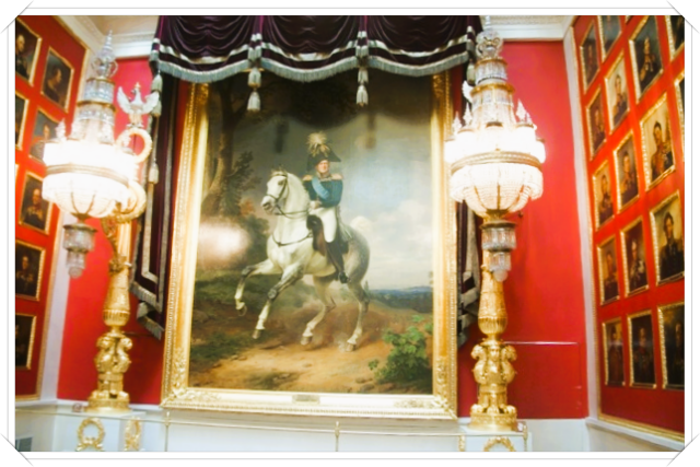 冬宫内的军人厅/军事画廊于1826年建成,狭长的走廊两侧墙上挂有332幅著名统帅和将领画像,都是1812年战争和远征法国(1813~1814年)的参加者。著名的英国画家道(1781~1829年)与其助手、年轻的俄国画家亚历山大·波利亚科夫(1801~1835年)一起用了十年时间创作了其中的绝大部分作品。位于走廊尽头身跨战马的沙皇亚历山大一世像由德国画家完成。