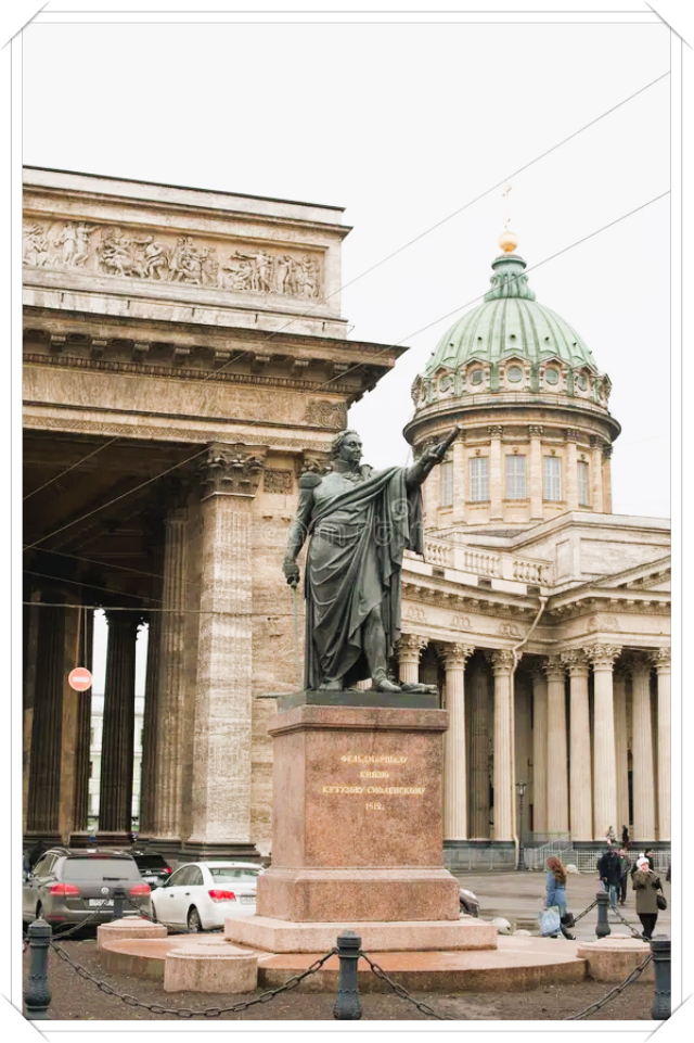 喀山大教堂为纪念1812年卫国战争而建,教堂前方有两位俄国统帅库图佐夫和巴克莱·德·托利的纪念雕塑。
