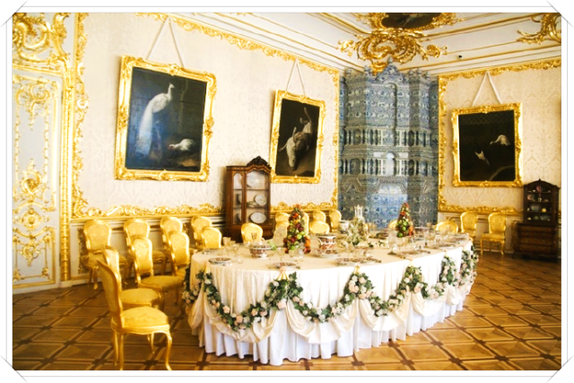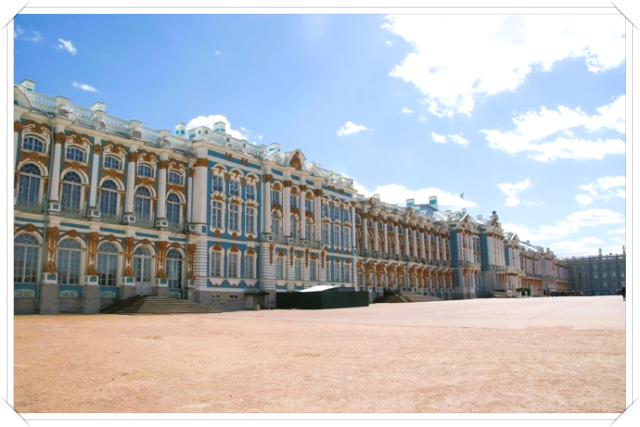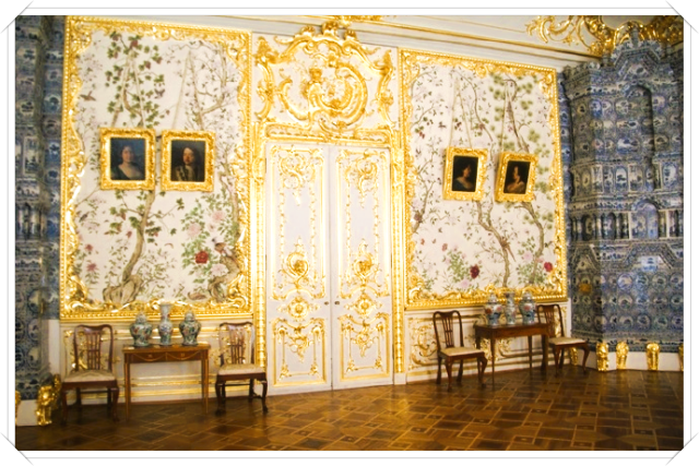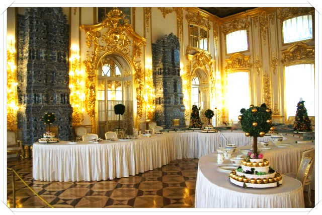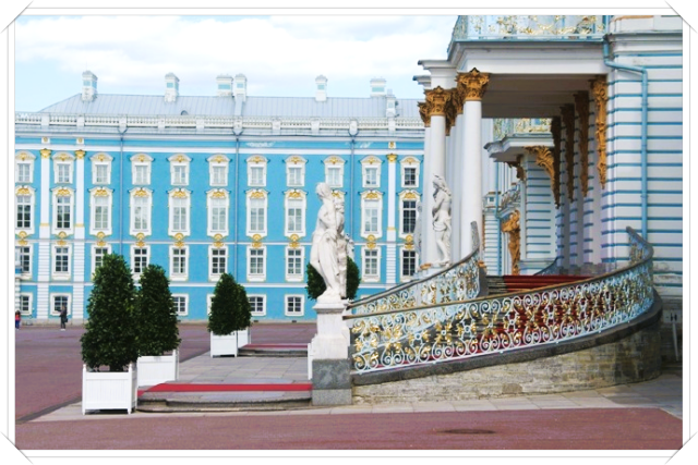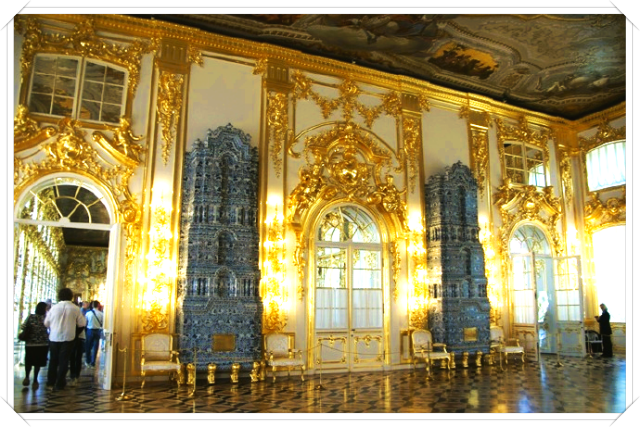 叶卡捷琳娜花园也称叶卡捷琳娜宫,是彼得一世为其妻子也就是后来的叶卡捷琳娜一世所建。始建于1708年。彼得一世死后叶卡捷琳娜一世在位两年,设立俄罗斯科学院是她的重要政绩。叶卡捷琳娜花园位于圣彼得堡郊外30公里处,又称皇村,这里出了一个巨人,就是辉煌的普希金。他作为王公贵族子弟的陪读在皇村中学学习了6年。王公贵族早已成为粪土,沙皇女皇也无法与其比肩。普希金是俄罗斯的,也是世界的。 宫殿也是巴洛克风格,宫殿内流光溢彩,被金光所笼罩,极尽奢华。