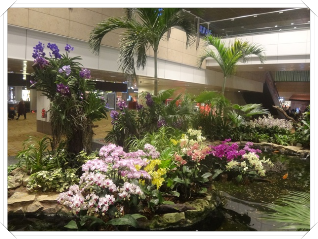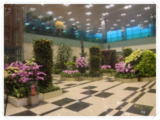 因为时间充裕,我们把T1、T2、T3航站楼都逛了。在新加坡机场内,我们有了不少意外的收获,这个机场是我们所见过的最美的机场。在T2,有蝴蝶花园。蝴蝶花园附近有一些躺椅,可以躺着休息,但我们游兴正浓,还不想马上躺着休息。后来又乘免费的机场巴士到T3,有2个很漂亮的花园,最后乘免费轻轨回到T1,Social Tree 很漂亮、很好玩,可以自己拍照片发到Facebook或自己的电子邮箱,我拍了几张,发自己邮箱,其中有一张发Social Tree,看它慢慢升到树上,慢慢变换着位置,直到被其它照片所替代,拍下了当时我的照片升上Social Tree的那一个瞬间。