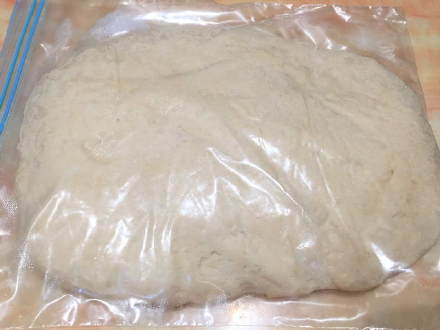 1、将面粉、酵母、苏打粉、盐、糖搅拌均匀后,加水搅成大朵面絮状,再加油,揉成面团,揉面手法最好是用拳头反复压扁,再叠再压扁,最终得到一个不粘手偏软的面团。把面团整理成长方形后,装入塑料食品袋密封,放入冰箱冷藏松弛一夜。