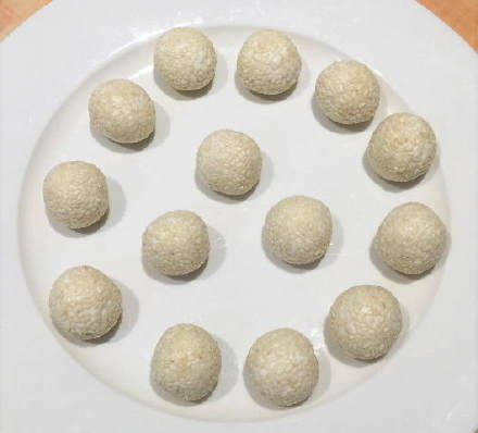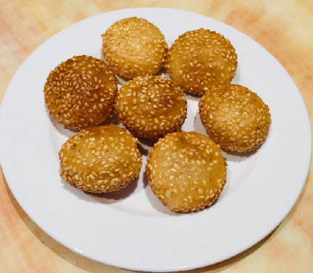 食材:糯米粉100g,白糖30g,温水70g,芝麻20- 25g,植物油适量。