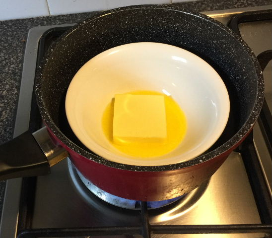把黄油放在炉子上融化,用椰子油也一样操作,假如使用液体的油,就省了这一步骤。