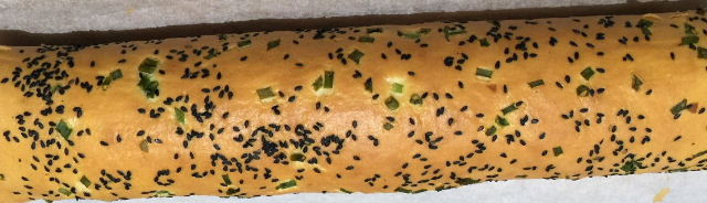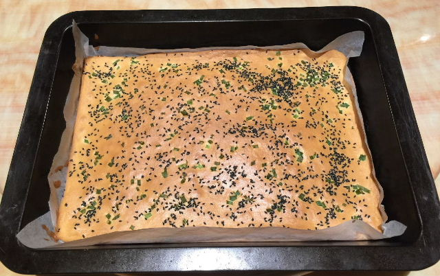 5、做好蛋糕糊后,倒入烤盘中。先用刮板将中间的面糊推向四角,然后左右两边晃动使面糊均匀摊开,最后刮平表面,在桌面上震3下,震出气泡。表面撒上香葱碎和黑芝麻。