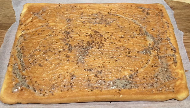 7、晾两分钟后,准备一张干净的油纸盖在表皮上,然后将蛋糕翻过来底朝上,趁热揭去底层的油纸,放至彻底晾凉后,抹上适量的沙拉酱,放上少量的肉松。