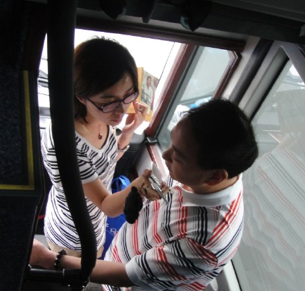 这次世博行,不得不提到那辆世博专线车。每天10班车,最早6:30发车,回程最迟晚上9点。我们乘的是7:30的车,车上53个人,只有25位是一般乘客,其余的人都是记者、主播和专业摄影师。有四个电视台、八个电台的人员在这辆车上。有导游,还为我们发了世博导游图。为保证世博的安全,我们还配合了车上的安检,查身份证,填旅客信息表。一上车每人发一个蓝色环保袋,内有饮用水、牛奶、香蕉和面包,吃的、喝的都有了。我接受了电视台的两次采访,第一次没有问是哪家电视台,第二次是浙江电视台的采访。为什么要找我?不得而知。采访结束,我也提了一个小小的要求:拍下一张浙江电视台的主播和摄影师的合影,与朋友们分享。当晚两个电视台的专题节目中出现了紫薇的形象,但本人没机会观看。