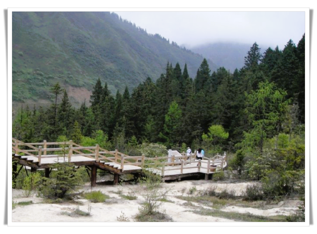 游览步道分为上山道和下山道,步道时而穿越原始森林,时而靠近钙化地带。黄龙古寺在山谷的最高点。古寺的前面是绵延不断的乳黄色长龙,身后是色彩缤纷的五彩池,再向后一边是玉翠峰,一边是雪宝顶。黄龙最美的景点是山顶的五彩池,景色独特奇丽,令人惊叹叫绝!