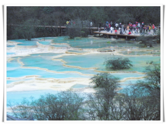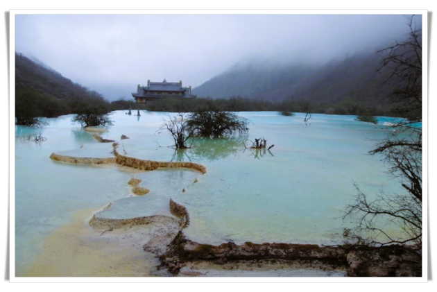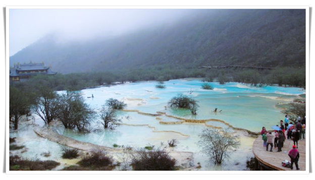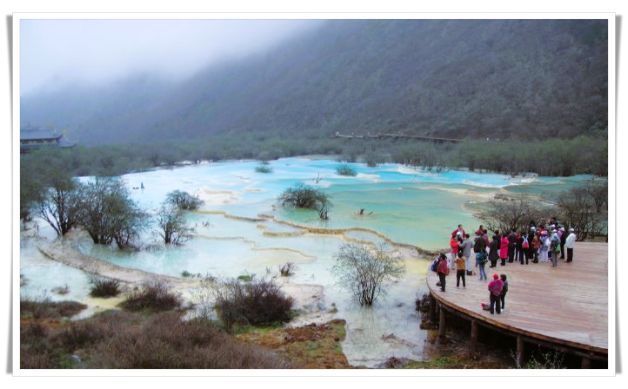 黄龙景区是国家级风景名胜区,与九寨沟同时列为世界自然遗产和世界人与生物圈保护区。景区内整个山谷几乎全被乳黄色的碳酸钙覆盖,从高处看去,宛若一条从岷山雪峰飞腾而下的黄龙,蜿蜒于茂林翠谷之中,黄龙由此得名。千层碧水形成层层叠叠的梯状湖泊、池沼。池水清澈透明无尘,水色因水底沉积物和树木、山色的千变万化,而呈黄、绿、浅蓝、蔚蓝等颜色。这样的岩溶地貌是非常罕见的,堪称人间仙境。
