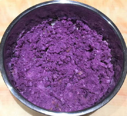 1、将去皮、切快的紫山药用沸水12分钟蒸熟,压成泥,加入500毫升牛奶、糖、椰蓉。再加入米粉和椰奶调匀成粉浆。