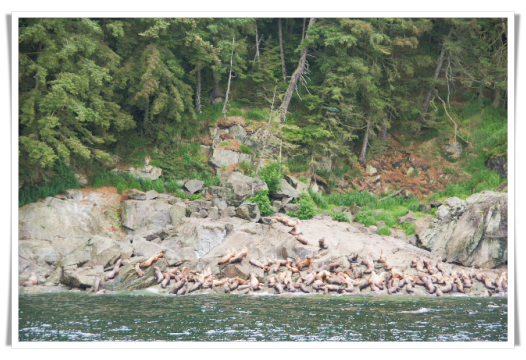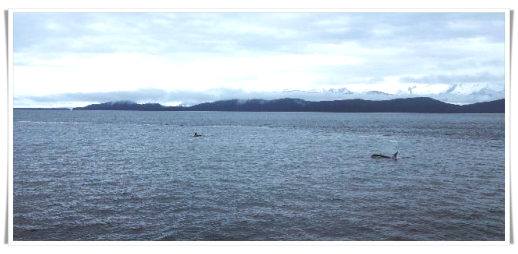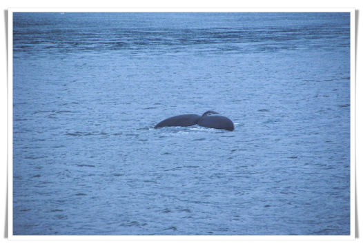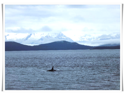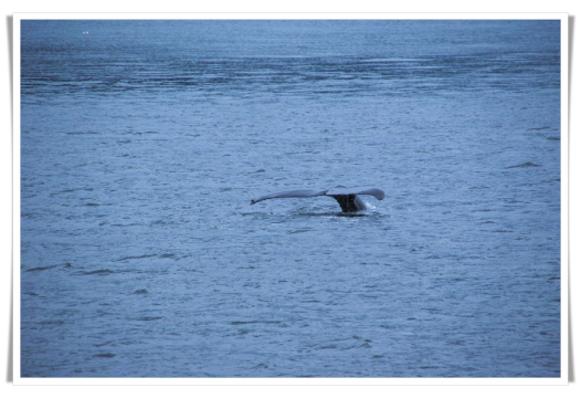 说是100%保证可以看到鲸鱼,否则退回100美元。两个半小时看鲸鱼,一个小时去冰川,然后返回邮轮。巴士半小时到码头,换游船去看鲸鱼。阴天,偶有小雨,山腰里云雾萦绕。还真是看到了不少鲸鱼尾巴和背部鱼鳍。