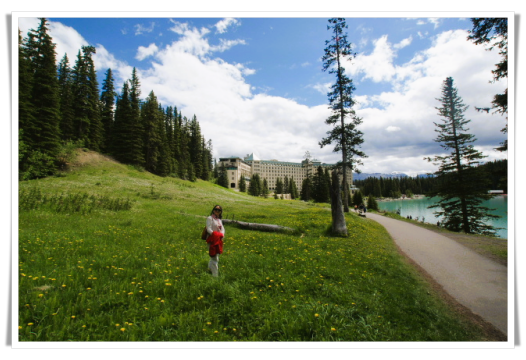 中午时分我们到达了露易斯湖(LAKE LOUISE),在这里逗留一个多小时,拍了集体照。露易斯湖坐落于加拿大的班芙国家公园,是班芙最著名的湖泊。因湖水含有冰川流下的矿物质,阳光下呈现清澈的蓝绿色,一如蓝宝石般瑰丽,而被誉为“落基山脉的蓝宝石”。