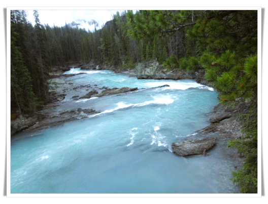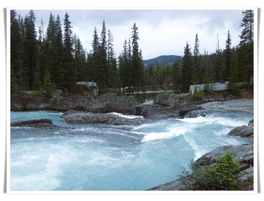 14日上午进入幽鹤国家公园(Yoho National Park),游览了天然桥 (Natural Bridge) 。天然桥是幽鹤国家公园最著名的景点之一。奔腾不息的河水在这里遭到了石灰岩的阻挡,岩石和河水均不妥协,河水偏要从石灰岩中间穿石而过,于是在历经了千百万年的冲刷之后,岩石上被侵蚀出了一个天然的孔穴,孔穴逐年增大,形成了今天奇特的天然桥。我们当然不能踏足天然桥,但与天然桥平行的建有一座木桥,河水从脚下轰鸣而过,令人胆战心惊,不得不由衷感叹大自然的鬼斧神工。
