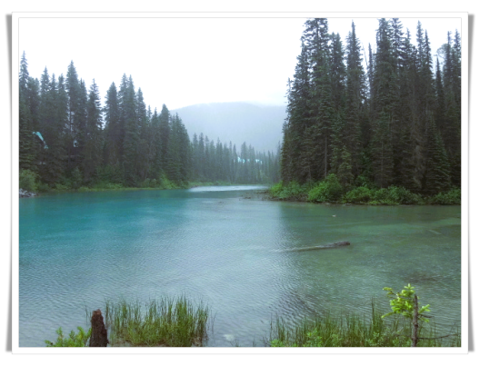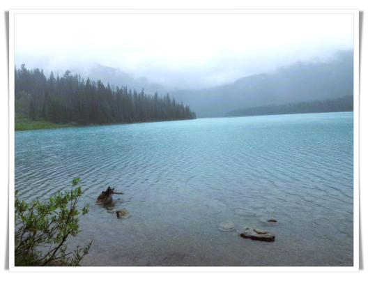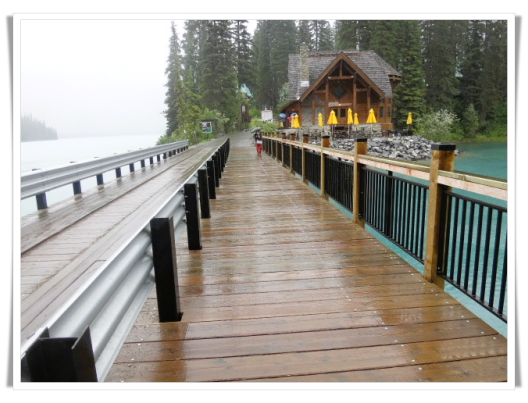 之后到达翡翠湖,停留半小时。翡翠湖位于加拿大阿尔伯塔省优鹤国家公园内,风景美丽迷人,湖水之翠绿令人称奇,被誉为“落基山的翡翠。小木桥将翡翠湖一分为二,桥那头的小房子就是翡翠湖客栈,这个客栈是建于1902年的百年老店。看着细雨朦胧的迷人景色,使我不由得联想到“山色空蒙雨亦奇”的故乡的西湖。