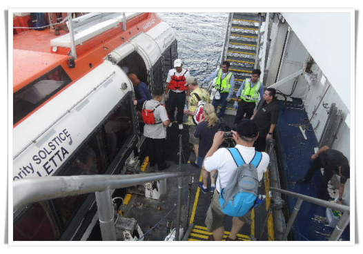 邮轮上组织的温馨服务:上救生艇之前送上一杯凉水和一块冰毛巾
