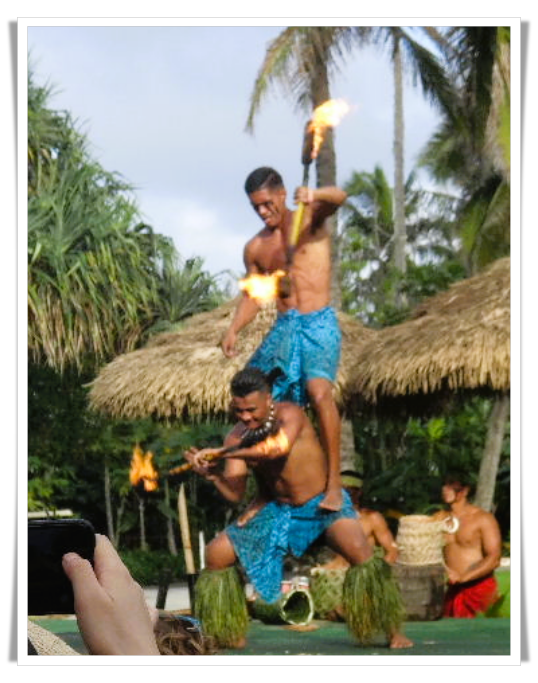 7:30露天剧场的演出开始,是由一百多位表演人员组成的盛大夏威夷传统歌舞表演,及惊险的夏威夷吞火表演。80分钟的演出,不能拍照。我们提早15分钟离开,为了照顾同车一个4岁左右的小女孩。晚上8:35导游即开车离开文化村,9:30就回到酒店。等演出结束就挤了,1千多人同时散场,车速一定很慢,原计划晚上10:00-10:15才能回到酒店。