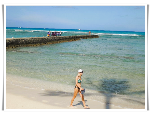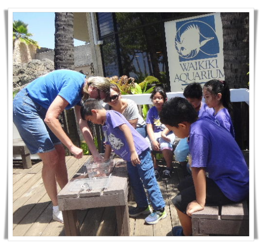我们还遇到了一群孩子,由老师带着在海边用面包喂鱼。我们走过去,老师还客气地把面包分给我们一起喂。之后,他们也去了同一个目的地——维基基水族馆。