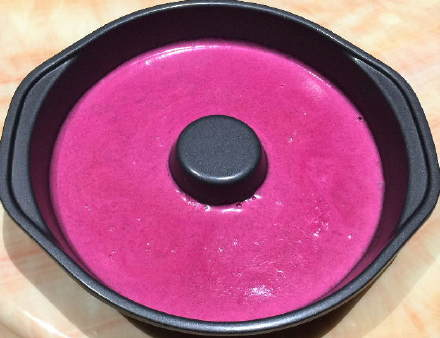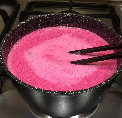 3、锅中倒入火龙果浆汁,加入上面2、的混合粉搅拌均匀,然后开中小火,边搅边加热,直至煮滚,再加入椰奶150毫升搅拌均匀,再次煮开即关火。