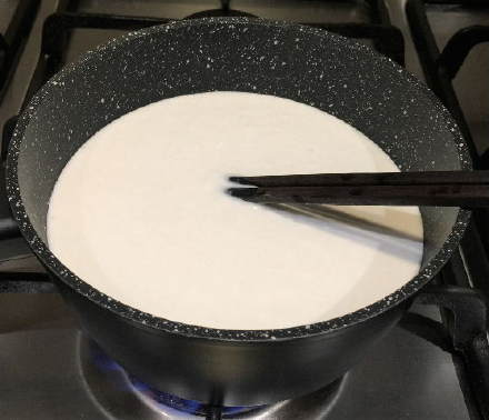 2、锅中倒入全脂牛奶300毫升,加入上面1、的混合粉搅拌均匀,然后开中小火,边搅边加热,直至煮滚,再加入椰奶200毫升搅拌均匀,再次煮开即关火。