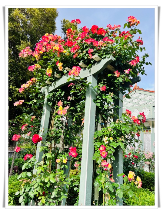 那一排排、一丛丛五彩缤纷的玫瑰在阳光下尽情舒展,仿佛大地铺展开一幅流光溢彩的画卷。树形玫瑰高贵挺立,灌木玫瑰热烈缠绵,三色化妆舞会的爬藤玫瑰在花架上交织,粉色、黄色、红色交错成一幅流动的层层叠叠的色彩乐章。