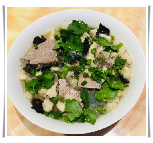锅内加入一大勺煮羊肉的汤,放入黑木耳、黄花菜或笋干丁煮开,然后加入馍丁煮2~3分钟。再放入粉丝和熟羊肉片煮2分钟,用盐、白胡椒粉调味后倒入大碗中,最后撒上香菜和葱花即可。(盛出时将羊肉片放在面上,每碗3-4片。)