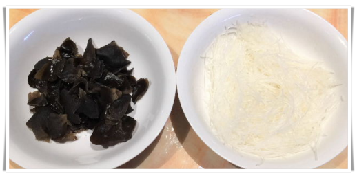 木耳最好用冷水隔夜泡发后,洗净撕成小朵。优质龙口粉丝冷水浸泡30分钟至泡发。黄花菜泡发后切段,或者用笋干也行,清洗后撕成条,然后切成小丁。香菜切成小段、小葱切成葱花。