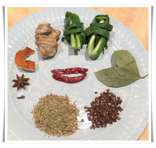 香料:小茴香10克,白胡椒2克,八角1个,香叶2片,花椒3克,陈皮1克,干辣椒2个,草果1个,丁香1个,桂皮1克。