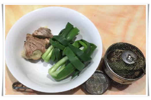 在高压锅底部放生姜片和葱结,再放入羊肉;将香料都装入调料盒中一起放入。
