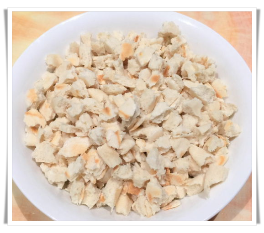 3、将晾凉的饼用手掰成花生米大小的丁,也可以用刀切。掰馍大小根据自己喜好,一般来讲越小越好。掰好的馍放在保鲜袋里,在冰箱冷藏室放半小时以上,煮的馍会更香。这次馍的量可以做5-6碗泡馍。