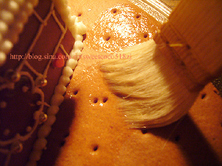 为了让“天呢屋”有个自然的下雪的院子,我想了好久,终于让我解决了。先用蛋清(不用打发)用软毛刷刷在姜饼表面,然后趁着湿马上密密筛上糖粉,等一小时以上干透,用干的毛刷轻刷去姜饼表面浮着的糖粉。然后再刷一层蛋清,趁湿再晒上糖粉,等一小时以上干透后,同样刷去表面的糖粉,效果就出来了。