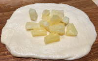 3、将面团分成8等分,菠萝丁也分成8等分。取一个面团,由内向里滚圆后,擀成包子皮大小,包入一份菠萝丁馅,从一端盖过去封口包住,稍微滚圆整形成小面包坯,依次放入抹油的戚风蛋糕模具。