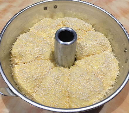 5、取出后,面包生坯上面刷蛋液,撒上芝麻。