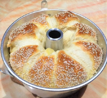 6、脱模:用面包刀在面包的周围和中间都转一圈,然后将模具倒过来,面包就很容易脱模啦。可以切片吃,也可以边撕边吃、边细细品味,别有一番滋味在心头。