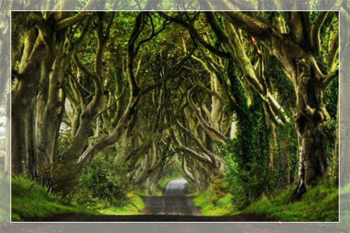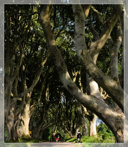 黑暗树篱 (The Dark Hedges)是世界上10条最美树隧道之一,道路两旁的150棵山毛榉树由斯图亚特家族(Stuart family)种于18世纪,它们组成了一个梦幻般的场景,仿佛一条通往未知世界的时光隧道。这条路是北爱尔兰最经常被人们摄入镜头的自然风景之一,也是电视连续剧《权力的游戏》中国王大道的取景地。