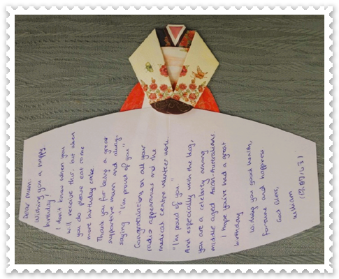 当紫薇吃着这只远道而来的迟到一个月的生日“蛋糕”,心里倍感温馨,亲情的温暖和被爱的感觉深深触动着心扉。儿子远隔千山万水,仍然记得我的生日!我生日那天,他正在韩国,就从韩国买了这件具有纪念意义的阿妈妮的“民族服装”,到达杭州的第一天,就写下自己的心愿寄出了。从这块充满爱的“蛋糕”中,我读到了他对妈妈的感恩之心,里面竟然还有儿子为妈妈而自豪的成分,更有对妈妈在主里的深深的祝福。幸福是什么?对紫薇来说,这就是幸福啊!