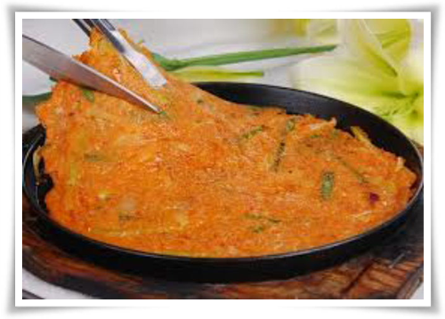 6、煎锅中倒入少许油,将拌好的面糊倒入锅中煎熟。食用前切块,蘸酱料即可。