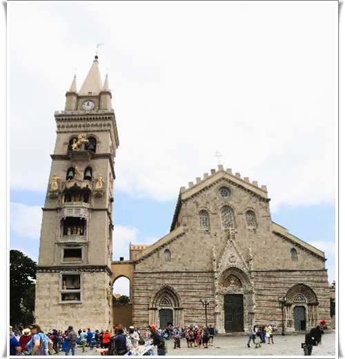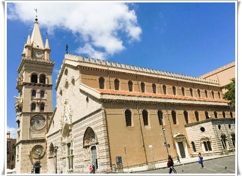 墨西拿教堂(Cathedral of Messina)建于12世纪,位于墨西拿的尼斯广场上,靠近邮轮码头。曾在100年前因火山喷发而摧毁,现在这座教堂是使用了原来相同的材料和技术重建的。墨西拿教堂木雕和壁画绝对让人叹为观止。墨西拿钟楼矗立在墨西拿教堂左侧,它是墨西拿标志性建筑之一。钟楼里建有世界上最大的天文学时钟之一,建于1933年。沿用至今,每天中午钟楼前会聚集很多游人,观看它报时。钟楼上上下下的人物造型雕刻均贴有金箔。