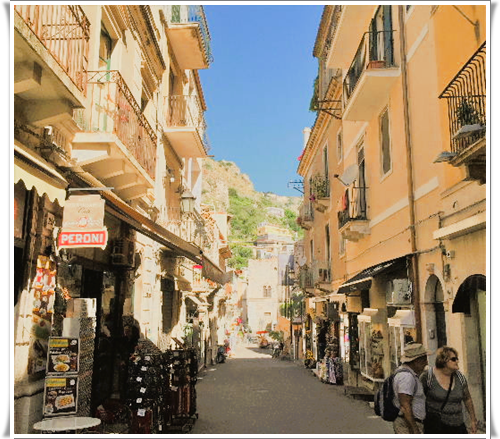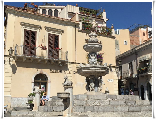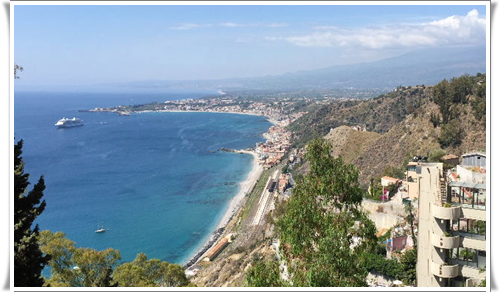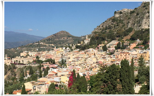 我们8点就下邮轮,仍然与旧金山华裔夫妇同游。近来天气都特别好,不但感觉舒适,而且拍的照片也美。我们四人乘一辆出租车,45分钟就到达了世界文化和自然遗产保护地陶米纳小镇(TAOMINA),司机让我们自己去玩两小时,上午11点就得往回开,途中在墨西拿山顶大教堂停了一会儿,之后到天文钟就结束了,共付150欧元。出租车司机的服务与昨天马耳他的路加无法比,收费又高,也许国情不同,意大利就是这样的。