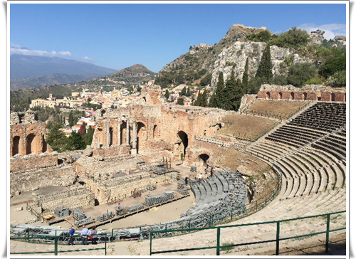 剧场的观众席设计也很特别,依着山坡的斜势呈环形展开,可容纳4,500名观众。座席后是高耸的围墙和疏散通道,设计上充分考虑了音响。坐在世界上最壮美的古希腊悬崖剧场,眺望欧洲最大、最高、最活跃的埃特纳火山和爱奥尼亚海,才知道什么是自然与历史的完美结合!