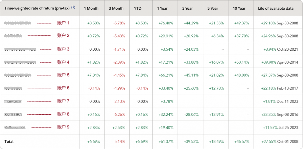 下面是截止至2026年1月末笔者通过FidelityInvestments(富达投资)进行投资的年化收益率表截图,以及同期的市场指数比对数据,其中: