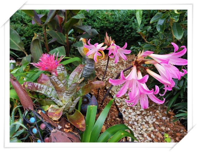 上次介绍过《鹿葱》Lycorissquamigera,开美丽的花朵。今年想不到不远处有棵凤梨科植物“蜻蜓菠萝”AechmeaBromeliaceae,同时也开花,两组花卉争相斗艳,花期都非常长。