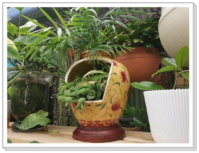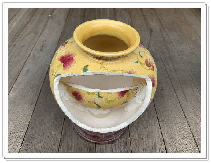 这是一只陶瓷花瓶台灯,电气部分的灯头已经损坏,灯罩已经没有了,但花瓶部分完好无损。开始我企图寻找哪个民族,哪个年代的陶瓷?无果。看来也不像现代中国风格的陶瓷,肯定也不是慈禧时代的古董。于是我就构思,利用这个花瓶部分做盆景。为了观赏性,我将花瓶的正面开一个窗口,利用割下的碎片,在花瓶内做一个隔离档,这样就形成上、中、下三层种植。