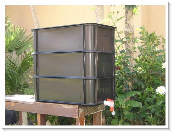 中层:蚯蚓下料槽,基本上全部和部分粉碎了的蚯蚓排泄物(固体),这个过程需要半至一年。当中间槽内基本没有食物时,蚯蚓会从镂空的上槽底部钻到上槽。所以当中槽内部基本没有蚯蚓时,就可以作为肥料使用了。