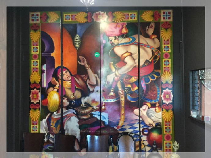 这家黎巴嫩餐馆位于墨尔本东区的Doncaster Rd,Balwyn North,入口是一扇很有民族特色的木雕大门,说起黎巴嫩,在圣经记载一种黎巴嫩特产的“香柏木”,这是当时所罗门王建造圣殿必备的一种木材。我很难确定这扇门就是用这种珍贵的木材制作的,但至少这具有一种象征性,有机会再进一步确证。大厅里还有一幅称之为“阿拉伯之夜”的壁画,描述阿拉伯人的生活。